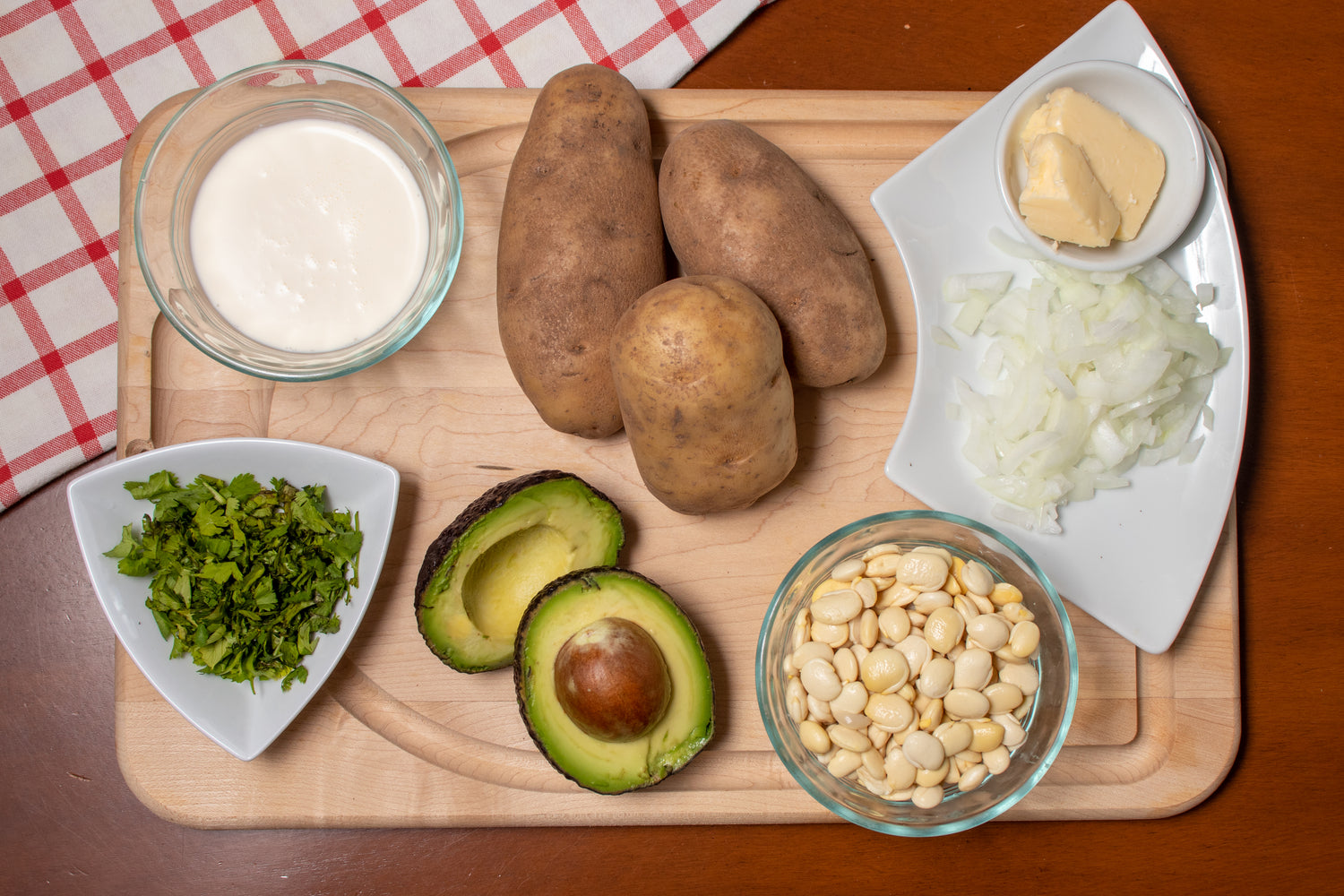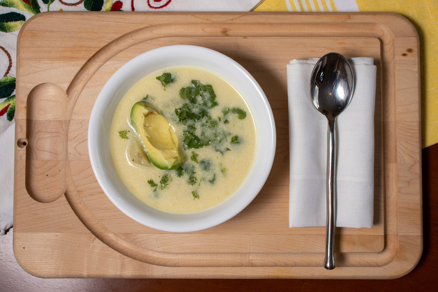 4: Add heavy cream, salt, pepper, and the blended mixture to pot with the remaining half of the potatoes. Bring to a boil. Cook for three minutes, then serve and garnish with cilantro and sliced avocados.
